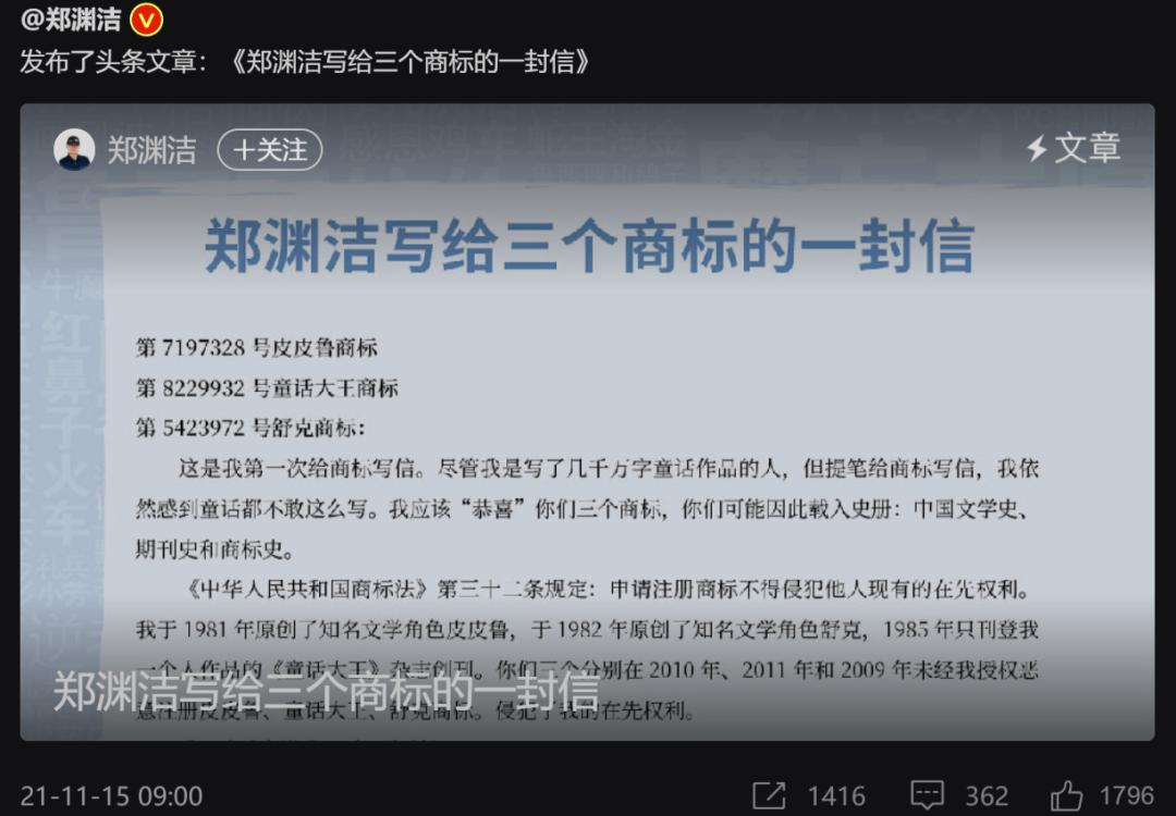 “我决定从2022年1月起,停止写作《童话大王》月刊,拿出全部精力对你们维权。你们的不知悔改殊死侵权,导致1985年创刊已经问世36年的影响了千百万读者总发行量超过2亿册的《童话大王》月刊于2022年1月休刊。”郑渊洁在信中喊话侵权商标。
