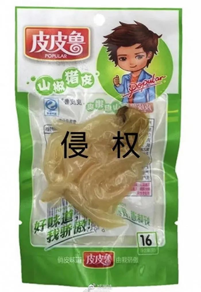 皮皮鲁卖猪皮肉:第7197328号皮皮鲁商标是成都自然人邹某鸿在2010年恶意注册的,被成都汇城食品有限公司用于售卖皮皮鲁牌猪皮肉。