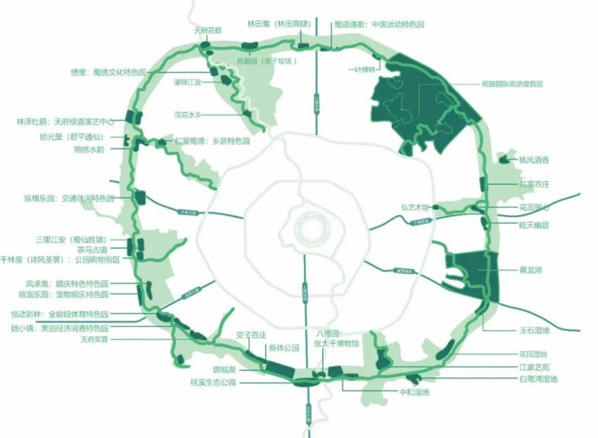 环城生态公园项目位于中心城区绕城高速两侧各500米范围及周边7大楔形地块,跨经12个区,涉及生态用地133平方公里,是天府绿道体系“三环”中的重要一环。