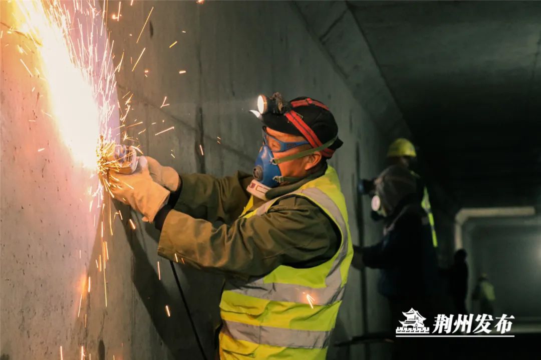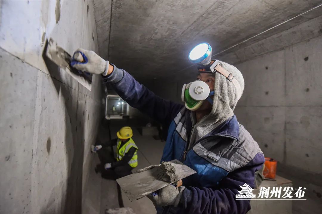白炽灯的照射下,干燥的空气中混凝土的气味扑面而来。在闪起电光火石中,工人们均戴上防尘口罩或举着手砂轮,或拿着铁抹子,正在清扫、修饰管廊墙壁,进行收尾工作。