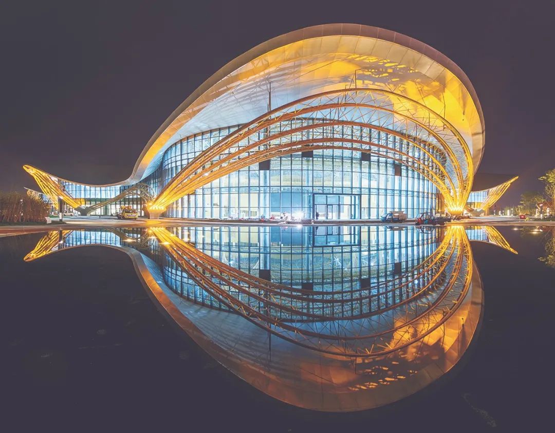 随着现代加工工艺的创新发展,人们对原竹进行防腐防蛀处理或复合加工,竹材的耐久性得到了显著提升,成为名副其实的“植物钢材”。四川宜宾国际竹产品交易中心是全球首例钢竹混合结构建筑体,为“以竹为主材的最大建筑,以圆竹为承重结构的最大建筑,以竹拱为装饰、单拱跨度最大的建筑”3项行业之最。该建筑将东方美学与现代建筑设计完美融合,今年5月建成之日起即成为宜宾市通往蜀南竹海要道上的一座地标性建筑。图为宜宾国际竹产品交易中心主体结构。