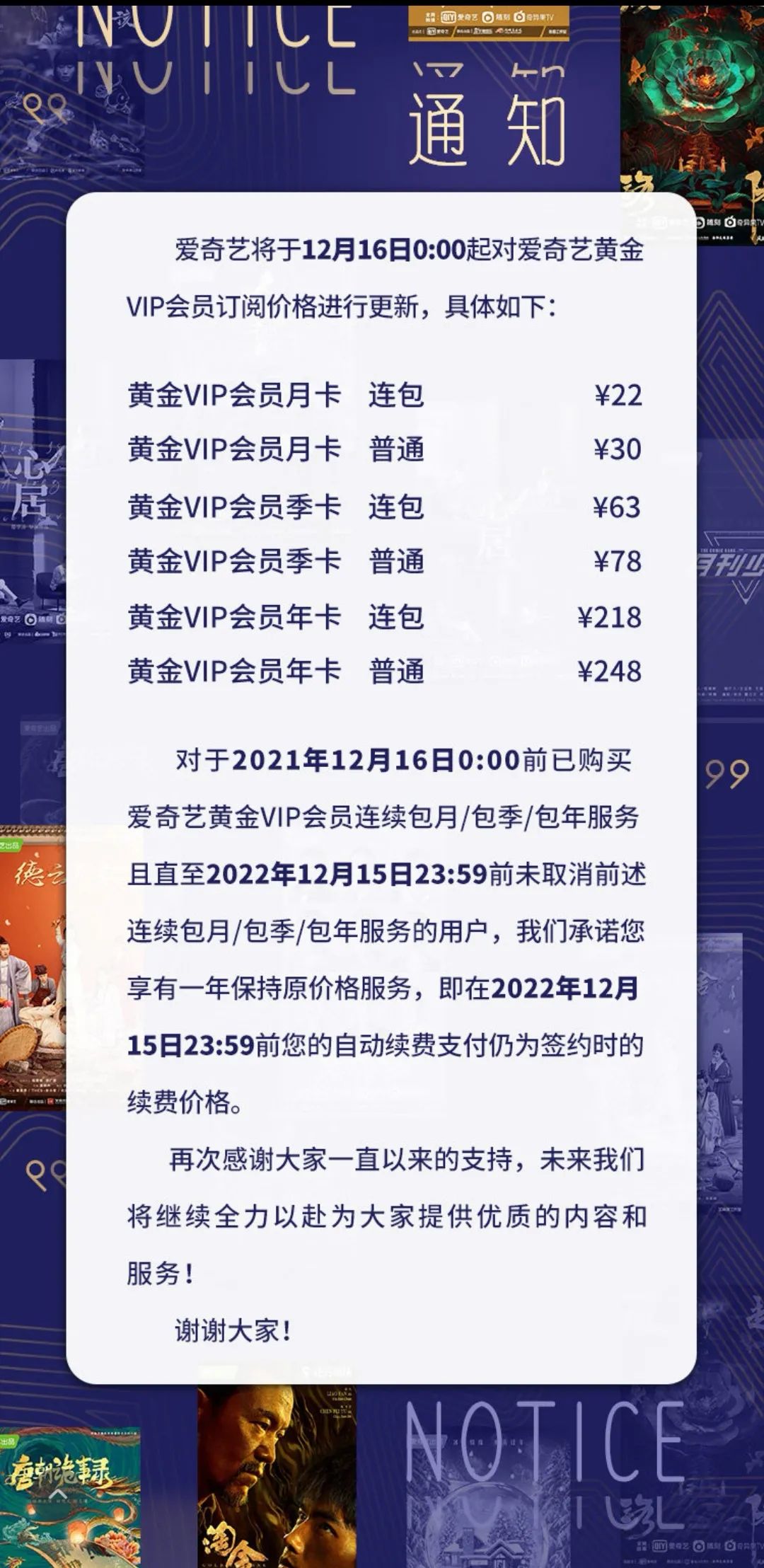 12月15日,爱奇艺VIP会员宣布涨价,年卡价格不变,月卡、季卡涨幅在9%-20%之间。