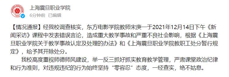 上海震旦职业学院16日通报称,经该校调查核实,东方电影学院教师宋庚一于2021年12月14日下午《新闻采访》课程中发表错误言论,造成重大教学事故和严重不良社会影响,根据《上海震旦职业学院关于教学事故认定及处理的办法》和《上海震旦职业学院教职工处分暂行规定》,给予其开除处分。