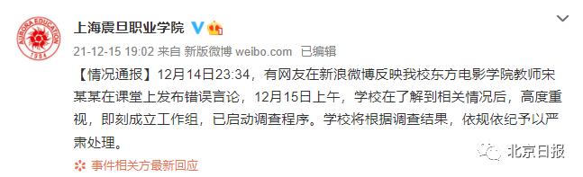 12月15日晚,@上海震旦职业学院 发布情况通报:12月14日23:34,有网友在新浪微博反映我校东方电影学院教师宋某某在课堂上发布错误言论。12月15日上午,学校在了解到相关情况后,高度重视,即刻成立工作组,已启动调查程序。学校将根据调查结果,依规依纪予以严肃处理。