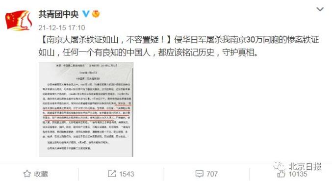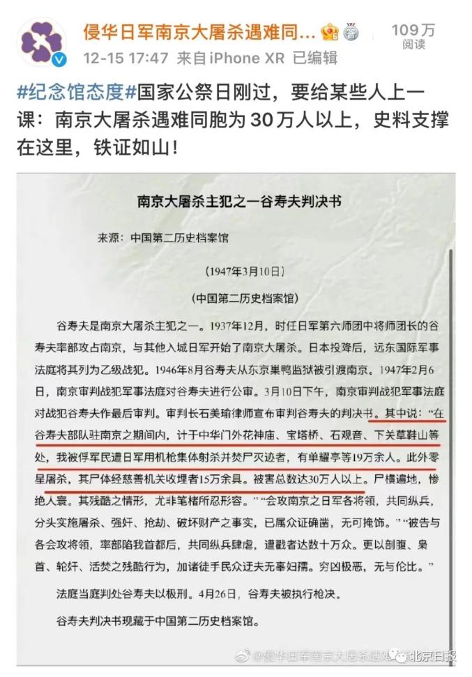 此外,@共青团中央 也引用了《南京大屠杀主犯之一谷寿夫判决书》的史料,并发微博称:侵华日军屠杀我南京30万同胞的惨案铁证如山,任何一个有良知的中国人,都应该铭记历史,守护真相。