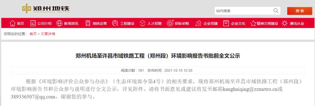 12月15日,郑州地铁集团发布公告,对郑州机场至许昌市域铁路工程(郑州段)环境影响报告书进行批前全文公示,公示内容包括线路站点、开通后的运营时间、行车间隔等。