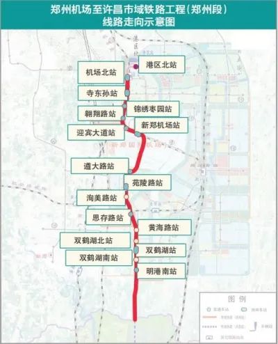 其中郑州段线路北端起于港区北站,南端止于郑州市界,主要沿巢湖路、华夏大道(原四港联动大道)、迎宾大道、机场、维州路(原航兴路)敷设,线路全长33.43km,设站16座。郑州段设港区北车辆段1处,新建设航兴路主变所1座。工程总投资约178.67亿元,工程计划施工总工期约3年。