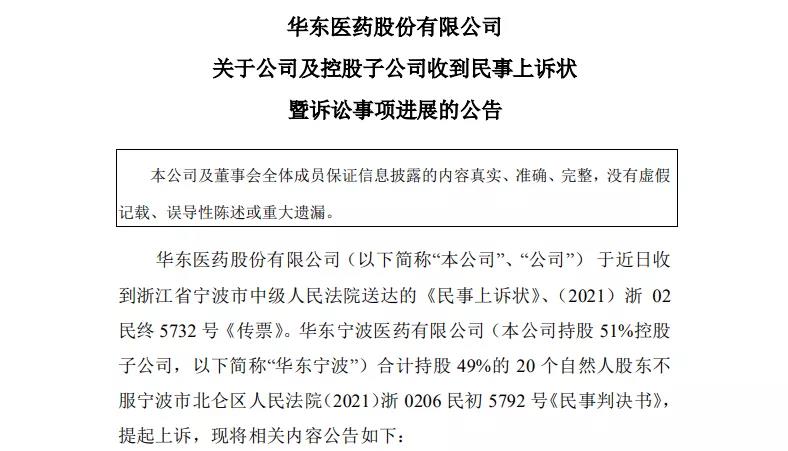 12月15日,华东医药公告称,就此前驳回原告诉讼请求的一审判决,华东宁波20位自然人股东(合计持股49%)作为上诉人,认为原审法院未能查清全部案件事实,适用法律有误,请求法院撤销(2021)浙0206民初5792号民事判决书,改判解散被上诉人华东宁波医药有限公司,本次案件将于2021年12月29日开庭。