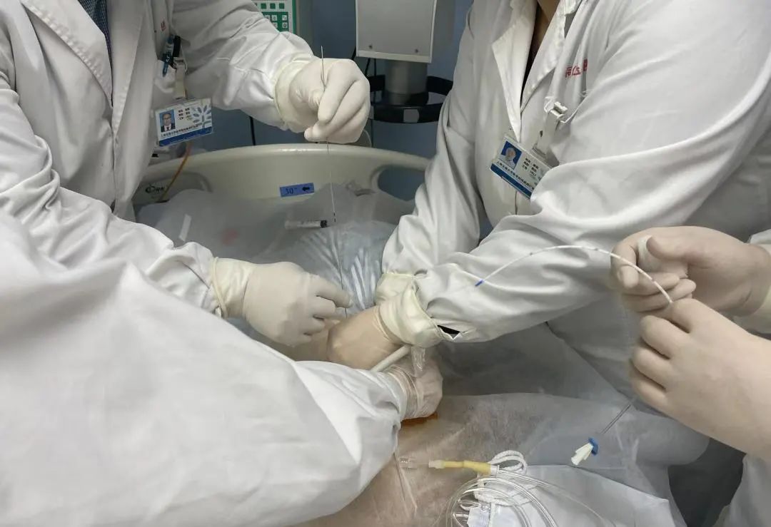 在超声介入医生准确的评估、完善的路径规划和娴熟的操作下,局麻——进针——减压——导丝——扩皮——置管——固定,一步步操作,按部就班、娴熟流畅、有条不紊的进行着,全程监控,避开血管,一次成功,安全顺利的完成了置管,即刻引流出草绿色胆汁50ml,经评估置管通畅,患者胆囊的危象得到了缓解,有效控制了胆囊肿大及胆管扩张带来的危险,给临床心梗对症处理及抗炎治疗赢得了时间。