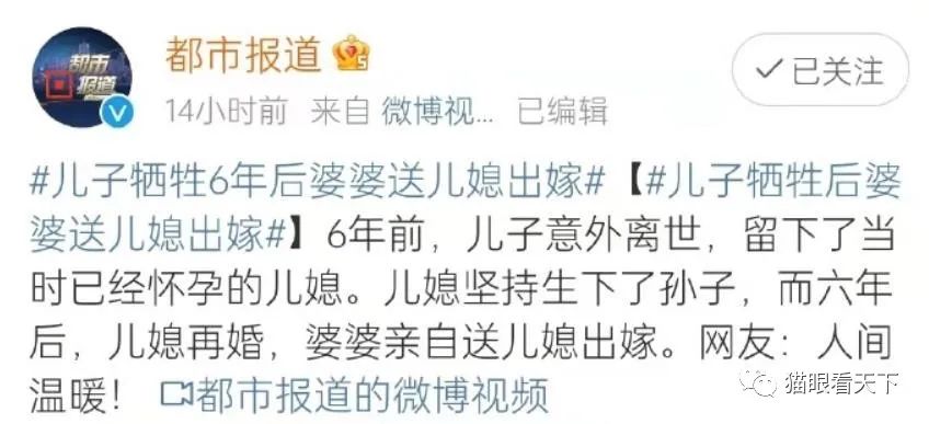 11月18日,110多家新媒体在社交平台转发@都市报道 的一条视频,文案是儿子牺牲6年后婆婆送儿媳出嫁。