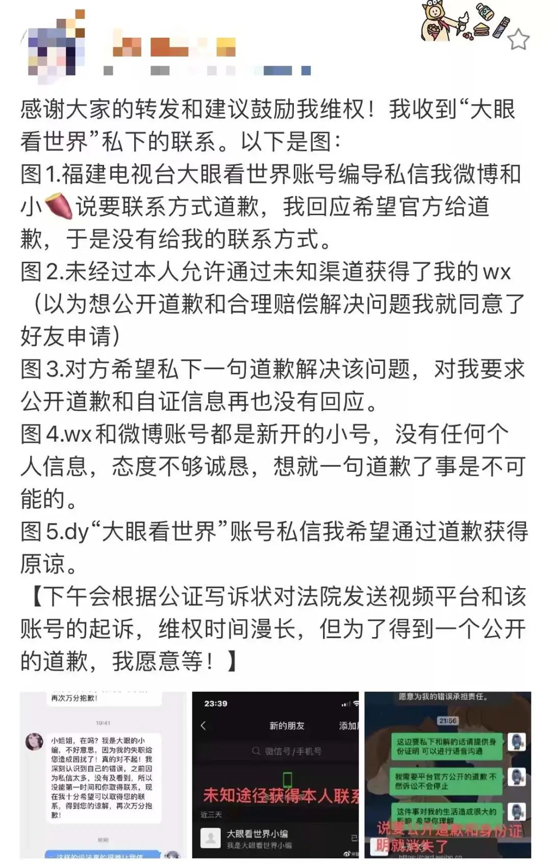 她与谣言发布者福建电视台“大眼看世界”取得联系,进行维权,但得到的是对方沉默的回应、不诚恳的态度、删除视频后一句简单的道歉。
