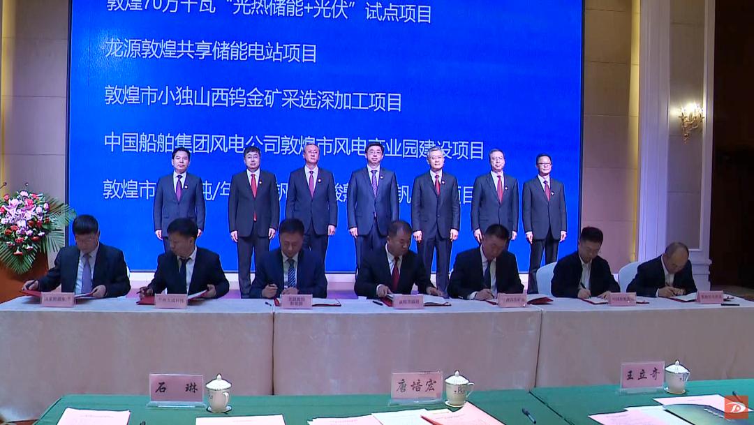 宋济民、路育刚代表敦煌市政府分别与项目代表现场签约。王立奇、唐培宏等领导见证签约。张毅、贾泰斌、梁建明、贺建生、陈国材等酒泉市和敦煌市领导参加签约仪式。