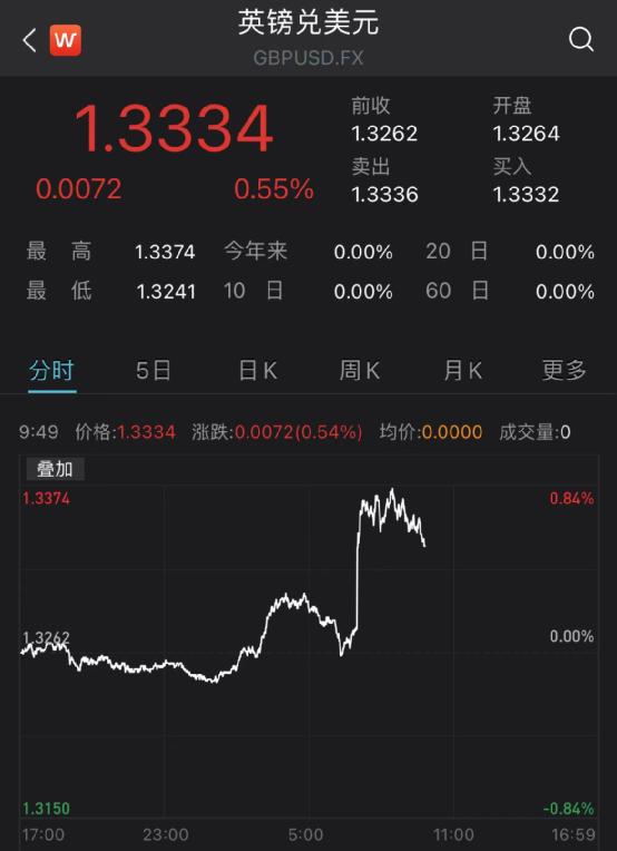 加息消息一出,英镑立马大涨,英镑兑美元汇率一度从1.3260拉升至1.3374,拉升超100个基点。