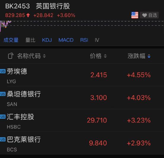 英镑上涨之际,英国国债收益率也跳涨,在英国展业的多只银行股也随即上涨。
