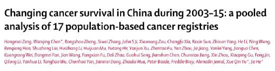[2] Zeng H, Chen W, Zheng R, et al. Changing cancer survival in China during 2003-15: a pooled analysis of 17 population-based cancer registries. Lancet Glob Health. 2018;6(5):e555-e567. doi:10.1016/S2214-109X(18)30127-X