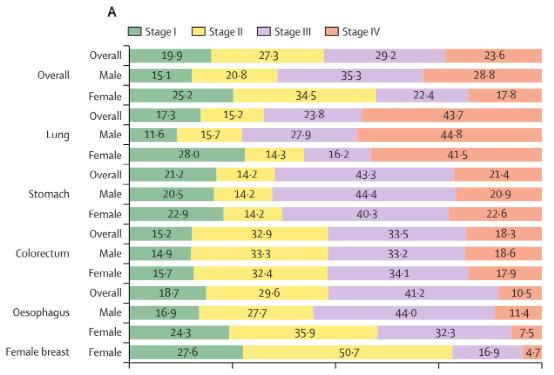 中国国家癌症登记中心联合多家单位,采集分析了2016年1月-2017年12月我国12个省份、23个地区医院登记的癌症病人电子医疗记录以及癌症登记中心记录,发现我国主要的五大癌症,包括肺癌、胃癌、食管癌、结直肠癌及女性乳腺癌,超过一半的患者在确诊时已经处于晚期阶段(3-4期),并进一步分析了影响癌症晚期诊断的因素,包括癌种、性别、地区、年龄等,该研究在本月初发表于柳叶刀·公共卫生。