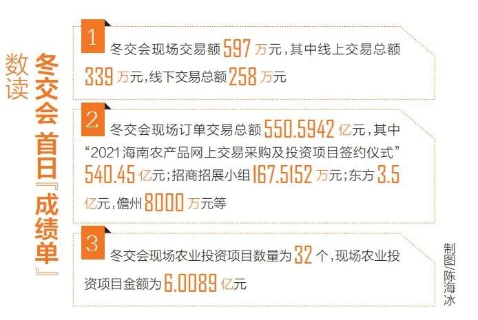 冬交会组委会披露,12月16日冬交会现场订单交易总额550.5942亿元,其中“2021海南农产品网上交易采购及投资项目签约仪式”540.45亿元。