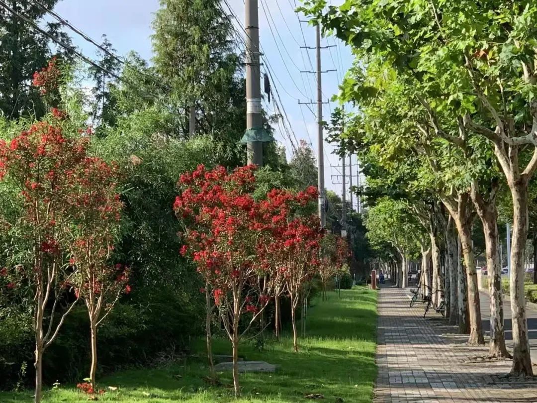 川环南路长1600米,行道树为香樟。中分带种有银杏、榉树,搭配樱花、美人蕉、紫薇等花灌木,配植蔷薇垂直绿化,让植物的整体布局更多层次、风格交融更多元化。