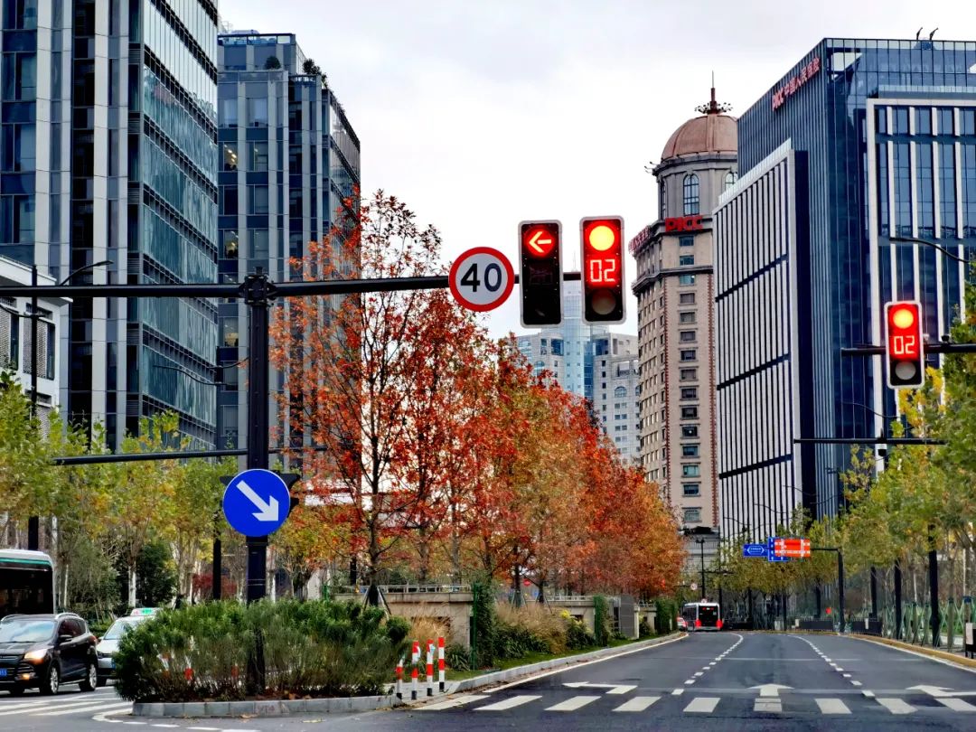 海伦路为双向六车道,长500米,行道树为北美枫香,部分段采用连接带形式,搭配种植萱草等不同植物,与机非隔离带种植的帚桃,营造出两季有花、一季有色的特色道路景观。