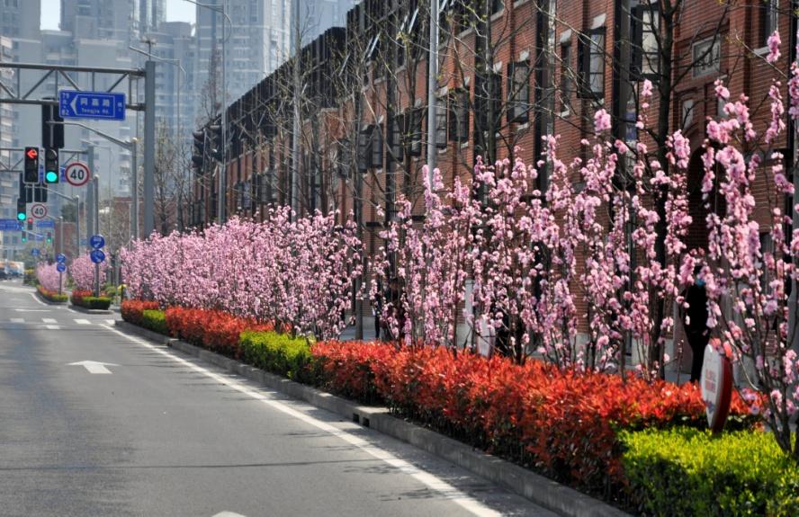 龙华(西)路为单幅路双向车道,长700米,道路以玉簪作为主体开花植物,搭配种植木本、宿根和草本植物。两侧采用果桃和花桃混种的形式,打造了桃花特色景观。桃花次第绽放,色彩浓淡相宜,高低错落相彰。