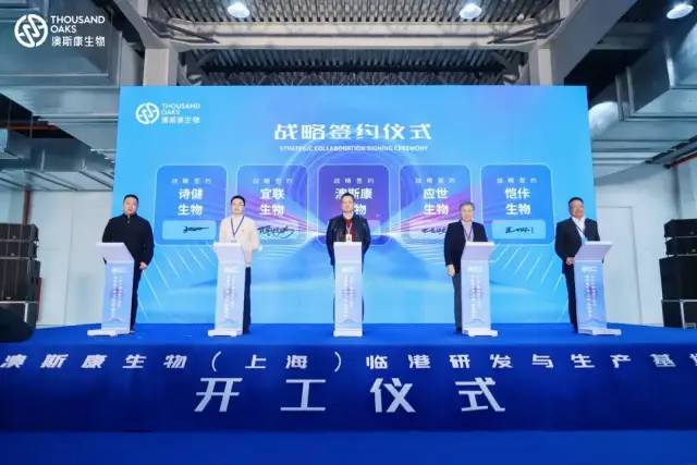 在开工仪式上,澳斯康生物分别与上海诗健生物科技有限公司、宜联生物(苏州)有限公司、应世生物科技(南京)有限公司和恺佧生物科技(上海)有限公司签订战略合约。