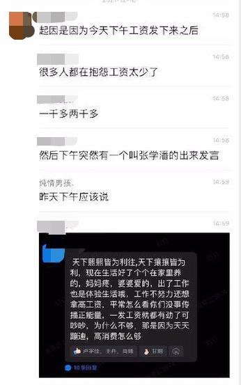 原本是一场普通的关于薪资待遇的讨论,氛围在某武汉区张姓员工一段“感恩”发言后突变,口水战就此展开。张姓员工表示:“工作不努力还想拿高工资......德不配位,必有灾殃......你有多大本事拿多少钱”。让长沙员工不能接受的是“其实工资发下来能理解,但是看着外区的人拿着6、7000一个月来骂我们拿1、2000的德不配位......觉得寒心。”