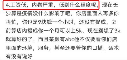 在社交平台上,有多名茶颜悦色员工表示因工资而辞职。据发帖内容,茶颜悦色人均工时11小时,时薪仅9元左右;有员工表示除去房租吃饭,工资所剩无几,也有人抱怨工作强度高,口播话术繁琐,还时常加班开会到深夜凌晨。