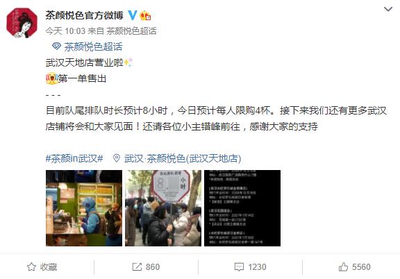 去年十二月,武汉首家茶颜悦色开业,奶茶店定于上午10时开业 ,8时店门口就排起长队,不少人还带着小板凳。上午10时许,茶颜悦色官方微博发文表示,站队尾的顾客预计排队时长8小时,每人限购4杯。现场有多位外卖跑腿小哥早晨7点就来排队了,跑腿费一杯100元。这个数值在今年茶颜于深圳开店时,涨到200元一杯。