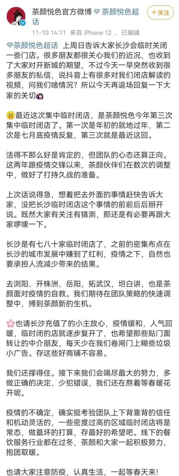 今年11月上旬,茶颜悦色宣布已在长沙临时关闭近百家门店,且表示本次集中临时闭店,是茶颜悦色今年第三次集中临时闭店。第一次闭店是在年初,第二次是在7月底疫情反复时。茶颜悦色称,“长沙是有七八十家临时闭店了,之前的密集布点在长沙的城市发展中赚到了红利,疫情之下,自然也要承担人流减少带来的结果。”