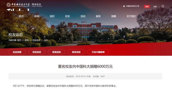 2018年9月,中国科学技术大学某匿名校友向中国科大捐赠6000万元,用于支持中国科大教学科研事业。