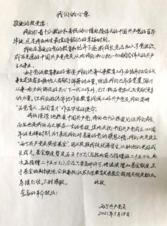 今年5月,江苏大学党委收到一封署名“两个共产党员”的信件,写信人捐款50万元,在学校设立“两个共产党员奖学基金”。