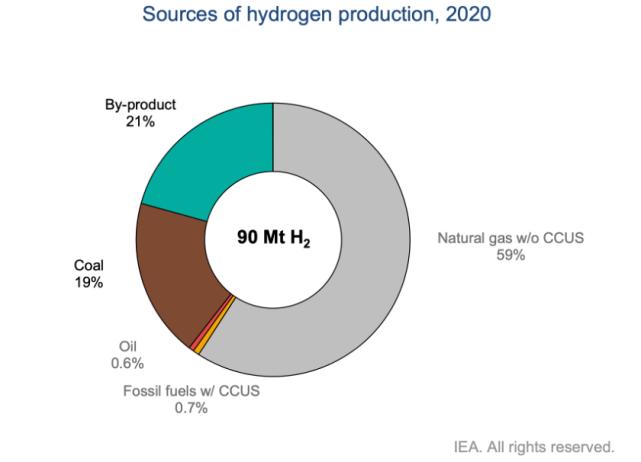 从国际能源署的统计来看,2020年全球生产的氢气,有78.6%是直接由各种化石燃料(59%天然气、19%煤炭、0.6%石油)加工得到的,21%则是化工生产的副产品。