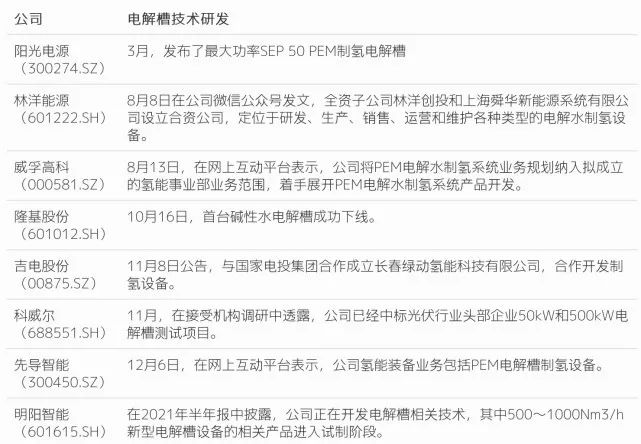 根据不完全统计,阳光电源(300274.SZ)、林洋能源(601222.SH)、威孚高科(000581.SZ)、隆基股份(601012.SH)、吉电股份(00875.SZ)、科威尔(688551.SH)、先导智能(300450.SZ)、明阳智能(601615.SH)等已经在开发或具备制氢电解槽技术。