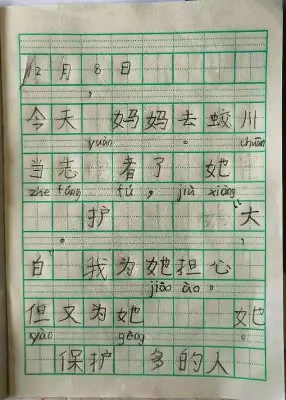 “儿子说想你。这是儿子今天写的,他说他很担心你。”顾晓草忙着换下一套防护服的时候,微信上不断地弹出家人的消息。顾晓草匆匆扫了一眼,视线停留在这一页拼田本上,一年级的孩子,笔迹稚嫩又可爱,有些不会写的字只能用拼音代替,但字里行间是满满的爱。