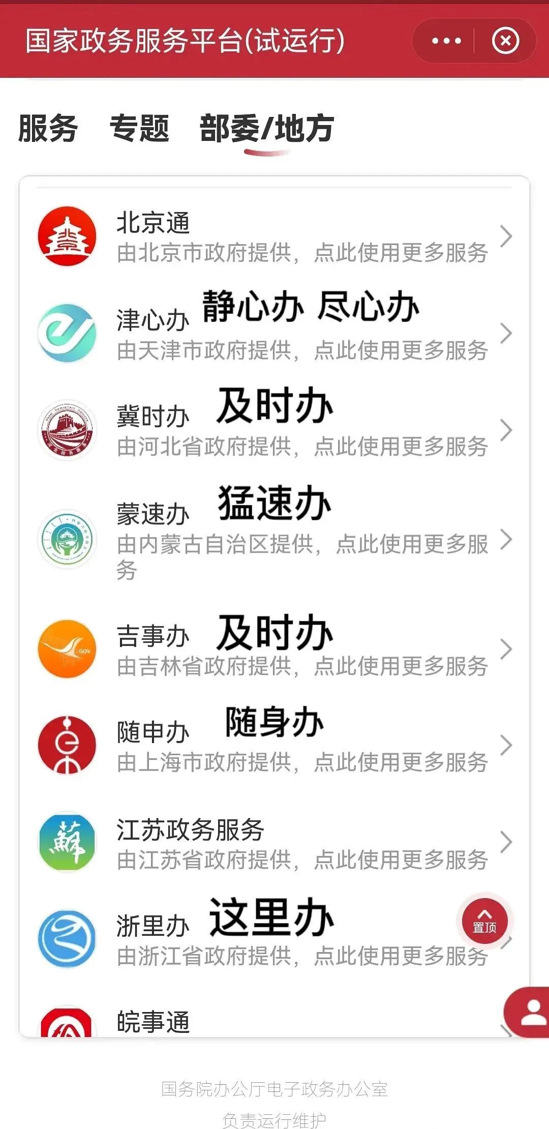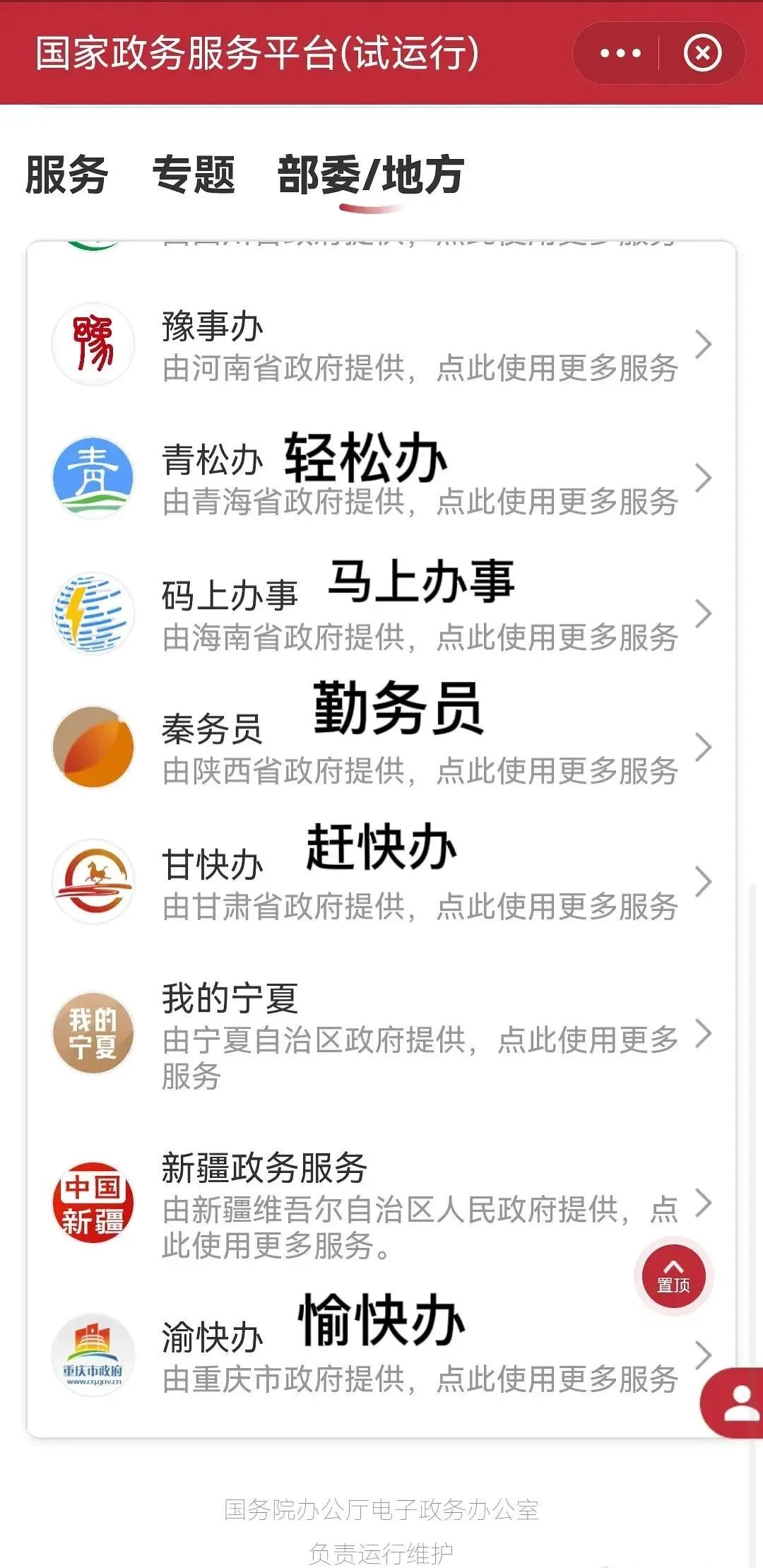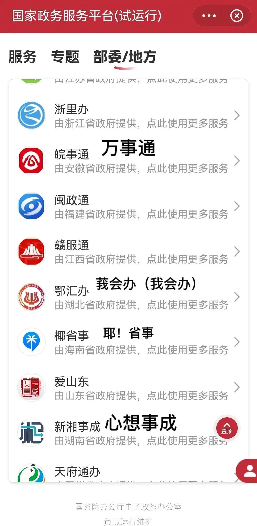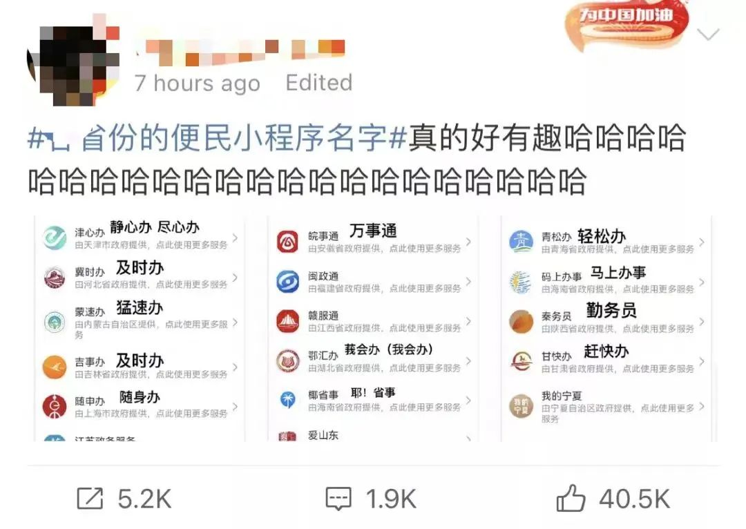 有网友发现,在国家政务服务平台的省级小程序一栏,各地就取名一事展开了暗戳戳的比拼,可以说赛出风格,赛出水平,顺便展现了地方风采,一起感受下。