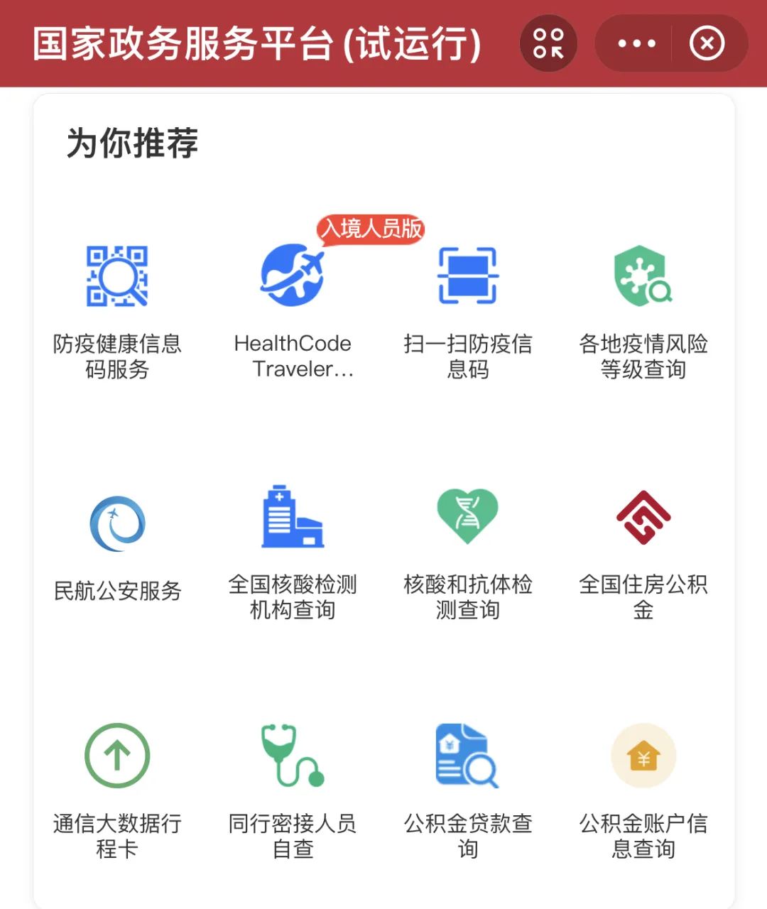 打开国家政务服务平台界面,防疫健康信息码、各地疫情风险等级、民航公安服务、核酸和抗体检测、住房公积金等服务板块一目了然。