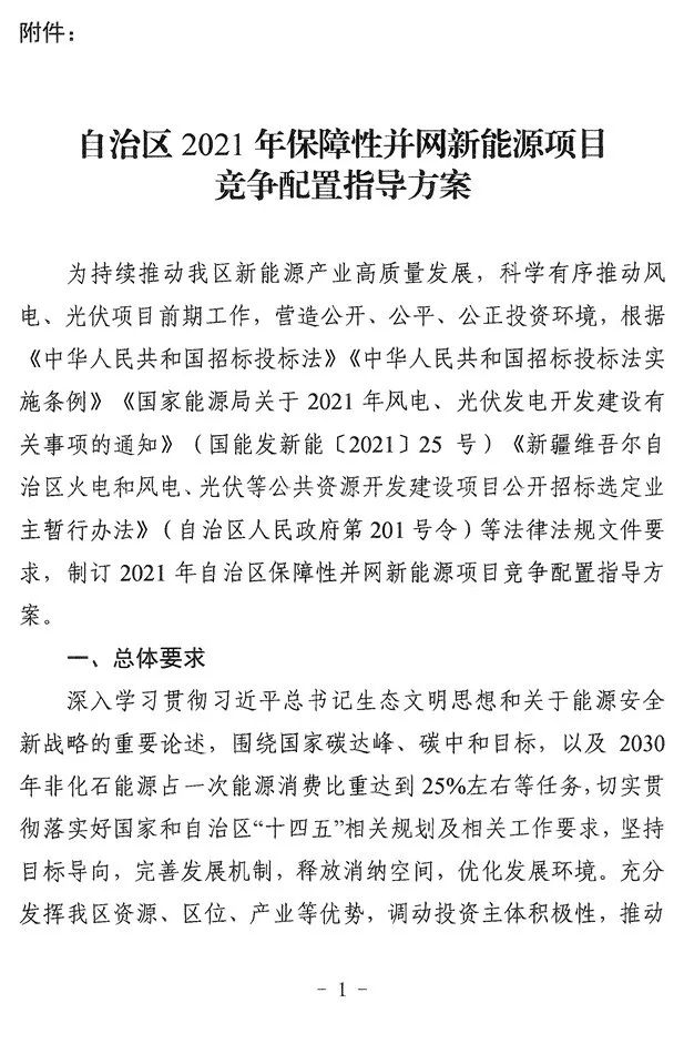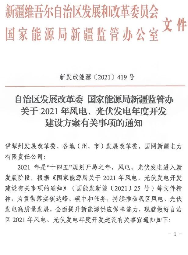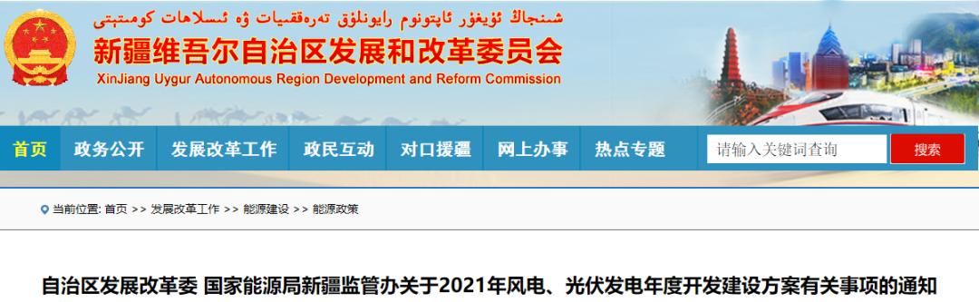 新疆发改委、国家能源局新疆监管办近日发布《关于2021年风电、光伏发电年度开发建设方案有关事项的通知》。