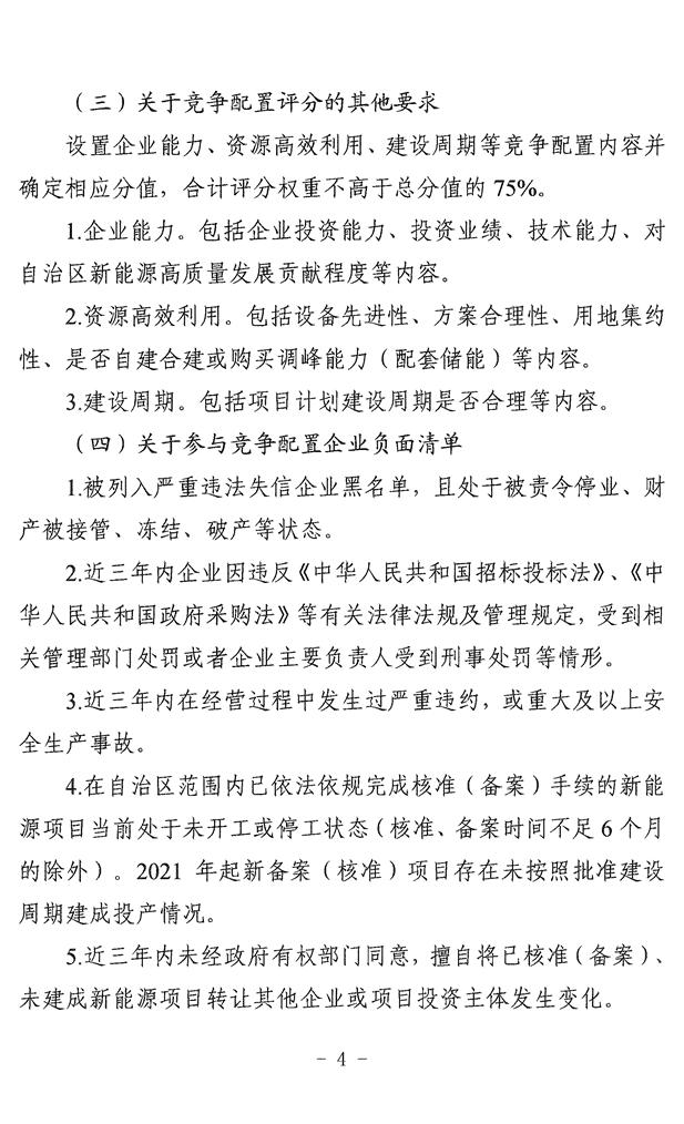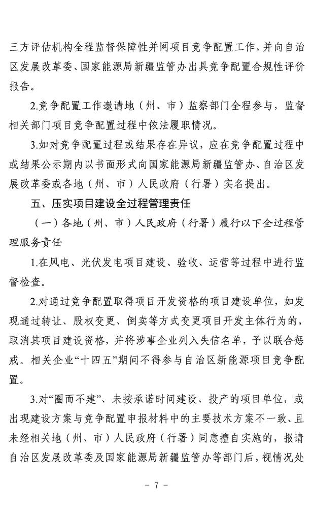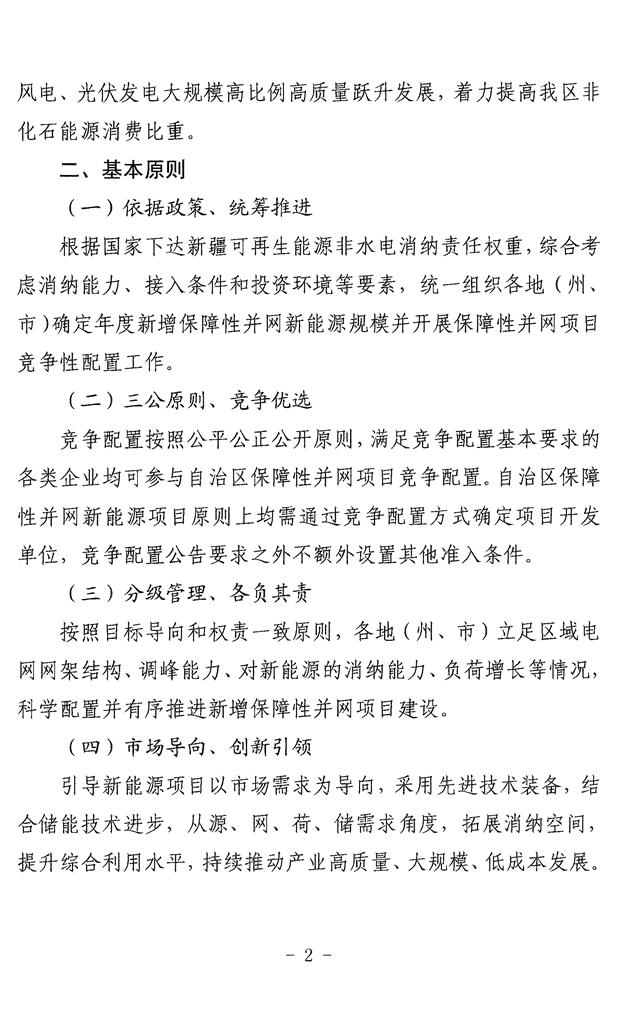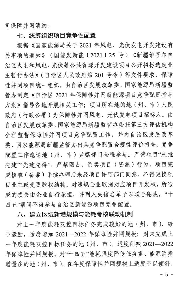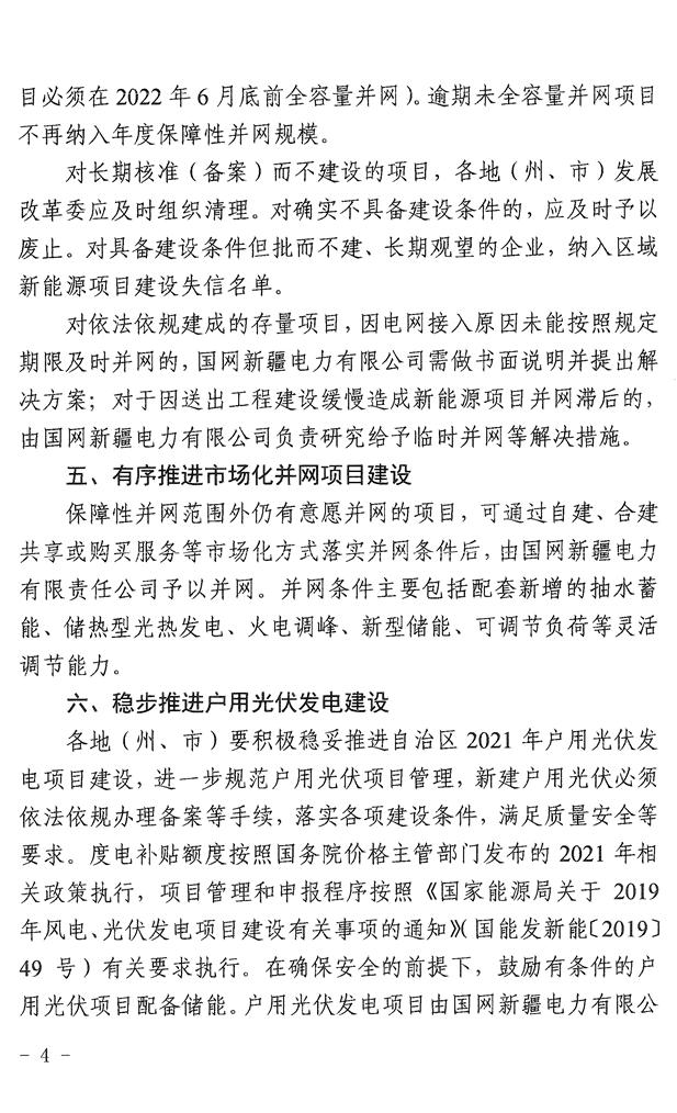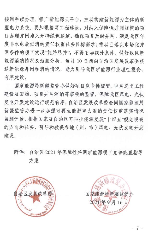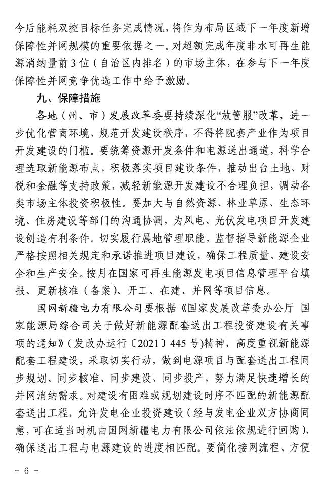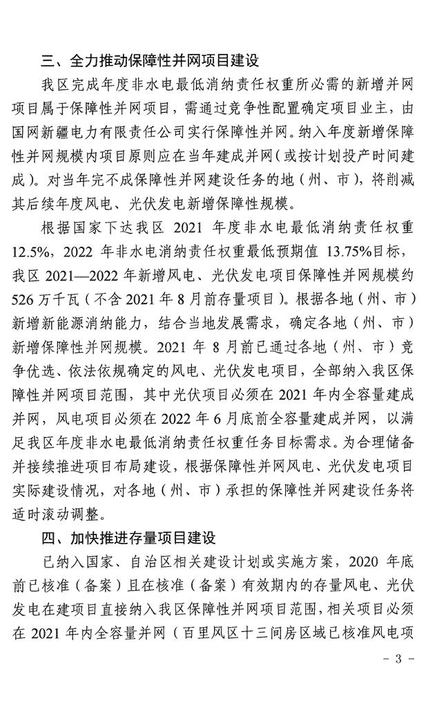 《通知》明确,根据各地(州、市)新増新能源消纳能力,结合当地发展需求,确定各地(州、市)新增保障性并网规模。2021年8月前已通过各地(州、市)竞争优选、依法依规确定的风电、光伏发电项目,全部纳入新疆保障性并网项目范围,其中光伏项目必须在2021年内全容量建成并网,风电项目必须在2022年6月底前全容量建成并网,以满足新疆年度非水电最低消纳责任权重任务目标需求。