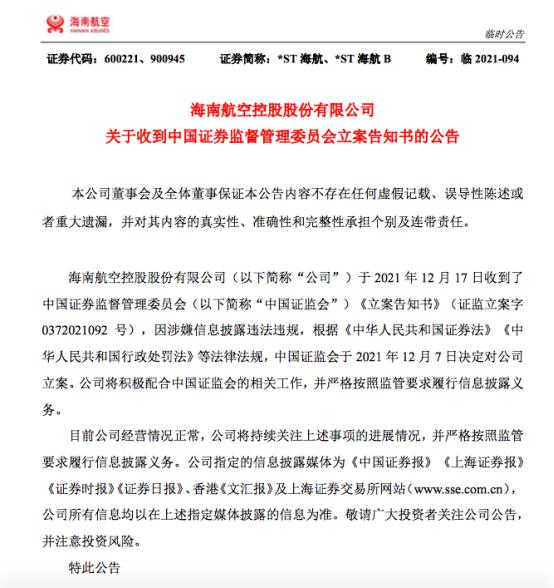 12月17日晚间,A股*ST海航、ST海越、*ST基础、*ST大集、ST海投以及新三板挂牌公司海航冷链,相继发布公司因涉嫌信息披露违法违规,被证监会立案。