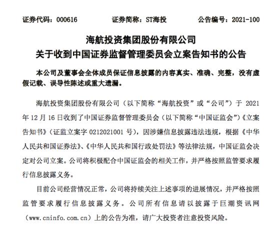 随后,*ST海航、*ST基础、*ST大集、ST海投等相继发布了类似公告,均收到证监会《立案告知书》,因涉嫌信息披露违法违规,证监会决定对公司立案。