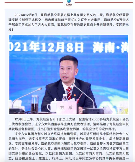 辽宁方大集团在官网披露,12月8日,是海航航空发展进程上具有历史意义的一天。海航航空经营管理实际控制权正式移交,标志着海航航空正式加入辽宁方大集团,海航航空6万余名干部员工正式加入了方大大家庭,海航航空在新的历史起点上开启新征程。