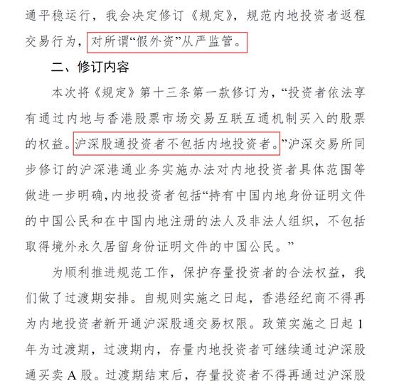 <内地与香港股票市场交易互联互通机制若干规定>的修订说明》,其中明确表示,将对所谓“假外资”从严监管,日后沪深股通投资者将不包括内地投资者。证监会称,此举是为进一步完善沪深港通机制。内地与香港股票市场交易互联互通机制若干规定>