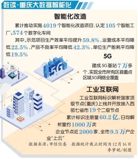 以大数据智能化为引领的创新驱动发展行动计划实施3年多来,重庆累计推动实施4019个智能化改造项目,认定105个智能工厂、574个数字化车间。其中,示范项目生产效率平均提升59.8%,运营成本平均降低22.5%,产品不良率平均降低42.3%,单位生产能耗平均降低19.5%,“智造重镇”轮廓初显。
