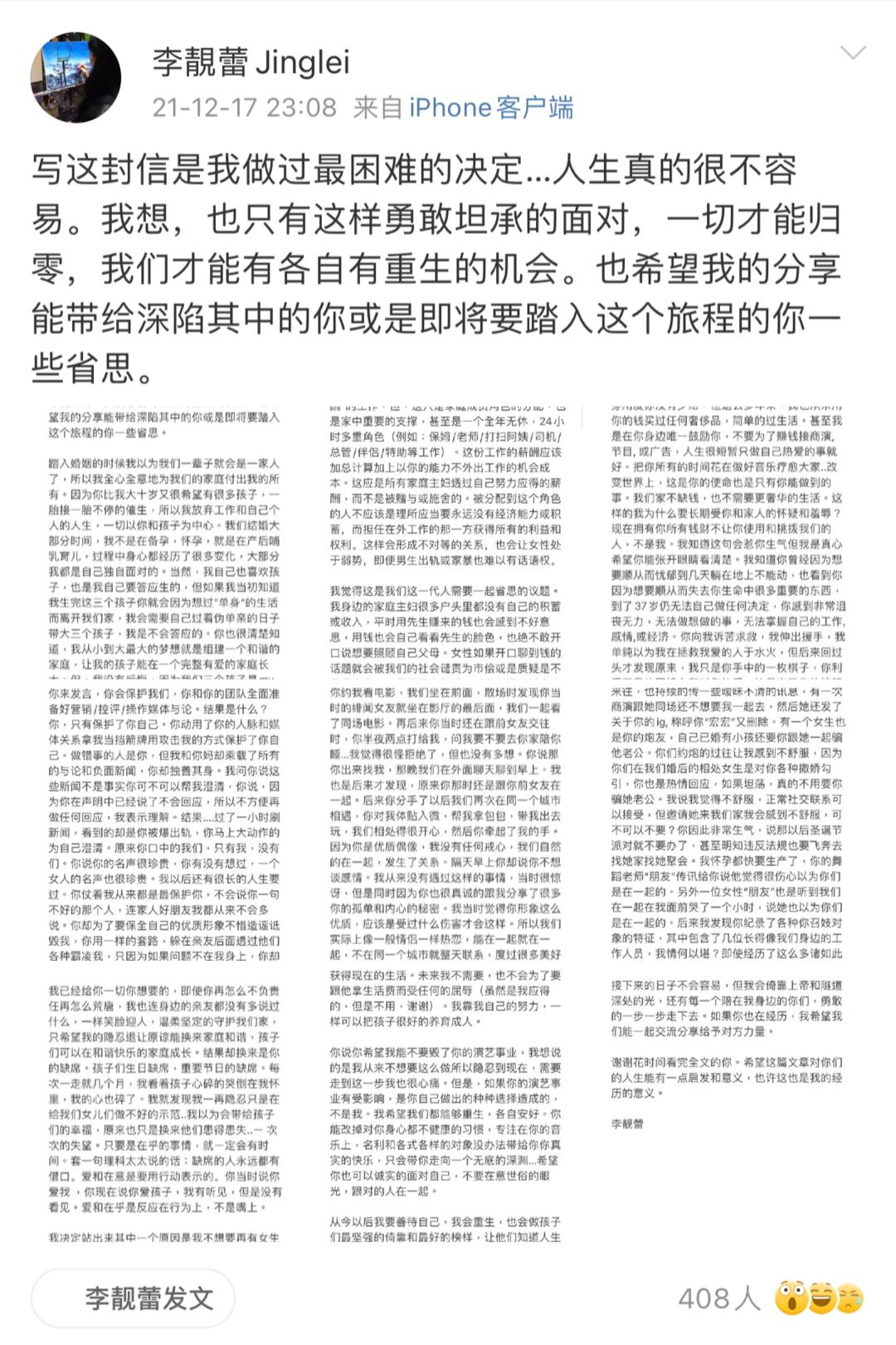 12月17日深夜,王力宏前妻李靓蕾发长文,李靓蕾称这么多年一直遭受王力宏家人的冷暴力和羞辱、签订不平等条约、王力宏“财产转移得很干净”、离婚曝光后王力宏把锅都给了她和妈妈、王力宏出轨,甚至在她怀孕的时候还在跟别的女生在一起,离婚原因是不想自己喜欢的女生被说成是第三者就坚决要离婚,她不同意就一直诋毁羞辱。