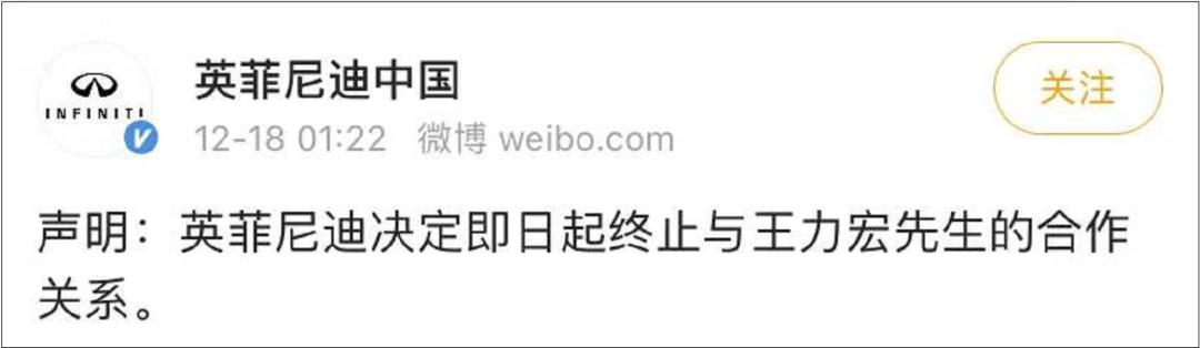 12月18日凌晨01:22,@英菲尼迪中国发出声明:英菲尼迪决定即日起终止与王力宏先生的合作关系。