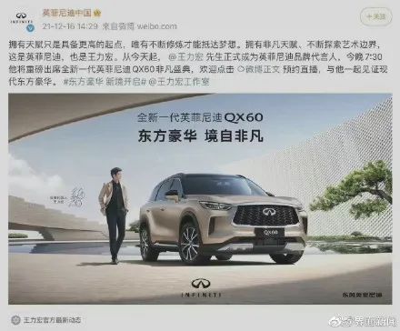 据了解,王力宏此前代言英菲尼迪是品牌方16日才官宣的。目前,@英菲尼迪中国已将该条官宣代言人微博删除。