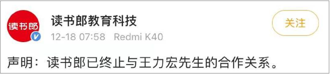另据了解,18日早间,@读书郎教育科技在其官方微博发布声明:已终止与王力宏的合作关系。