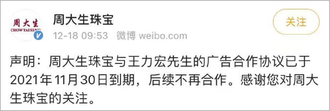 随后,与王力宏曾有过合作的@周大生珠宝在其官方微博发文表示:此前合作协议已到期,后续不再与王力宏合作。