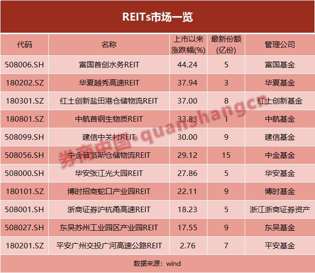 截止12月17日, 11只公募REITs产品全部实现正收益,平均涨幅27.33%,5只产品涨幅超过30%,富国首创水务REIT表现最好,累计涨幅44.24%。