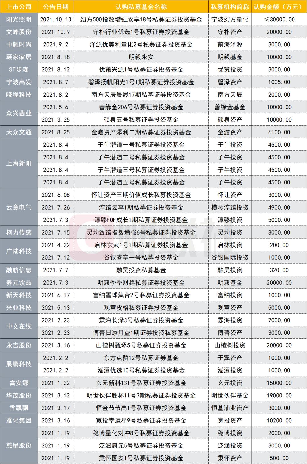 数据显示,年内已有阳光照明、三木集团、文峰股份、中胤时尚、顾家家居、ST步森、宁波高发、晓程科技、众兴菌业、上海新阳等26家上市公司,认购了来自32家证券类私募机构的总计36只私募基金产品。